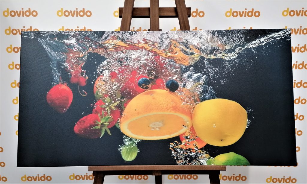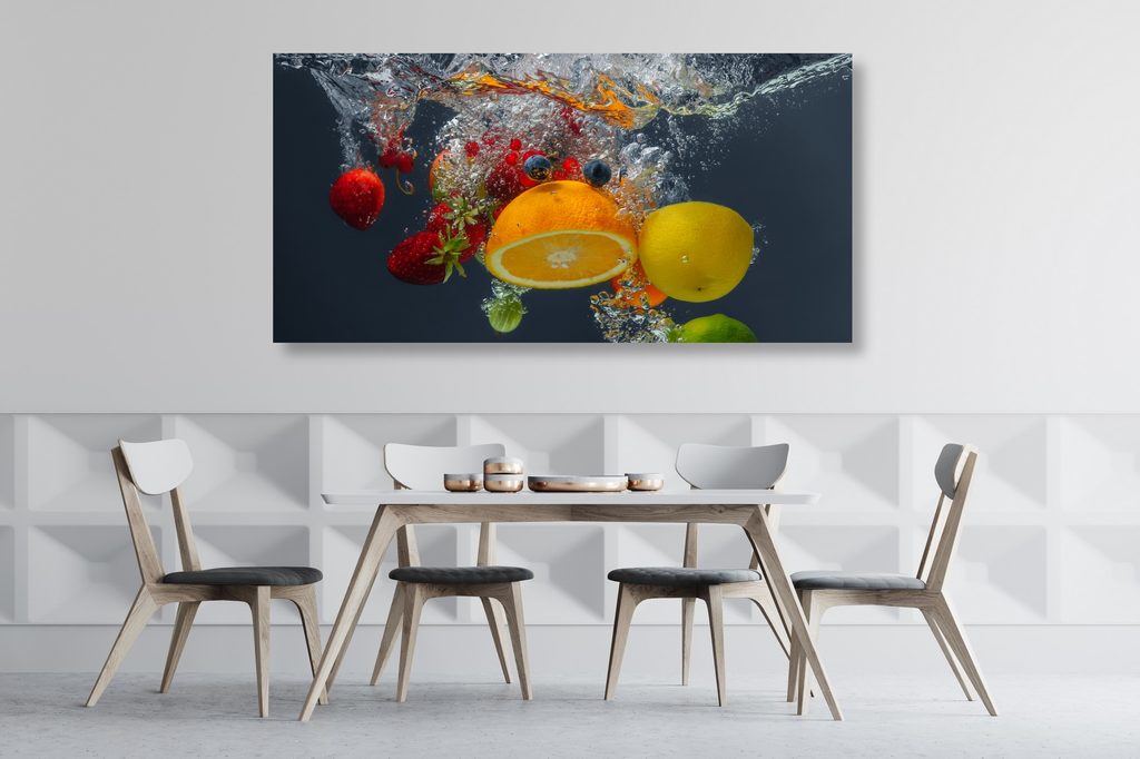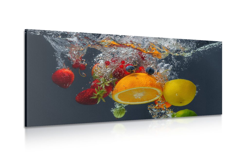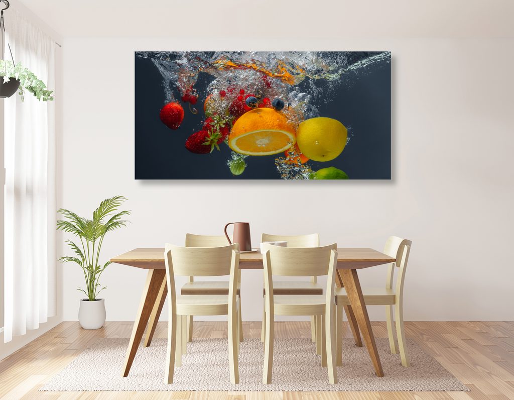 Obraz zachycuje fascinující pád ovoce do vody, který vyniká živými barvami a dynamikou. Mezi plody najdeme šťavnaté jahody, citrony a limetky, které vytvářejí hravou atmosféru. Voda kolem plodů se třpytí a vytváří efekt pohybu, což dodává obrazu energii a svěžest. Tento motiv je ideální pro moderní kuchyně nebo jídelny, kde podtrhne svěží a zdravý životní styl. Kvalitní tisk a pečlivé zpracování zaručují dlouhou životnost a jasnost barev.