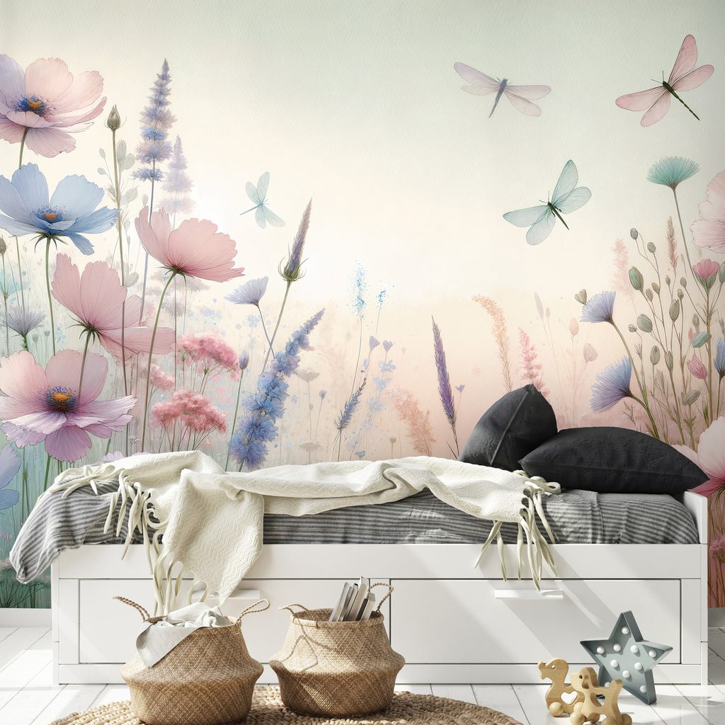 Samolepící fototapeta pastelové květy a vážky